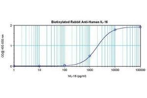 Usage: The applications listed have been tested for the unconjugated form of this product. Other forms have not been tested. ELISA: To detect hIL-16 by direct ELISA (using 100 μL/well antibody solution) a concentration of 0.25-1 μg/mL of this antibody is required. This biotinylated polyclonal antibody, in conjunction with compatible secondary reagents, allows the detection of at least 0.2-0.4 ng/well of recombinant hIL-16. To detect hIL-16 by sandwich ELISA (using 100 μL/well antibody solution) a concentration of 0.25-1 μg/mL of this antibody is required. This biotinylated polyclonal antibody, in conjunction with Polyclonal Anti-Human IL-16 (LS-C104445) as a capture antibody, allows the detection of at least 0.2-0.4 ng/well of recombinant hIL-16. Western Blot: To detect hIL-16 by Western Blot analysis this antibody can be used at a concentration of 0.1-0.2 μg/mL. Used in conjunction with compatible secondary reagents the detection limit for recombinant hIL-16 is 1.5-3 ng/lane, under either reducing or non-reducing conditions. -