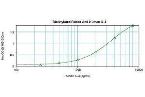 Usage: The applications listed have been tested for the unconjugated form of this product. Other forms have not been tested. ELISA: To detect hIL-3 by direct ELISA (using 100 μL/well antibody solution) a concentration of 0.25-1 μg/mL of this antibody is required. This biotinylated polyclonal antibody, in conjunction with compatible secondary reagents, allows the detection of at least 0.2-0.4 ng/well of recombinant hIL-3. To detect hIL-3 by sandwich ELISA (using 100 μL/well antibody solution) a concentration of 0.25-1 μg/mL of this antibody is required. This biotinylated polyclonal antibody, in conjunction with Polyclonal Anti-Human IL-3 (LS-C104470) as a capture antibody, allows the detection of at least 0.2-0.4 ng/well of recombinant hIL-3. Western Blot: To detect hIL-3 by Western Blot analysis this antibody can be used at a concentration of 0.1-0.2 μg/mL. Used in conjunction with compatible secondary reagents the detection limit for recombinant hIL-3 is 1.5-3 ng/lane, under either reducing or non-reducing conditions. -