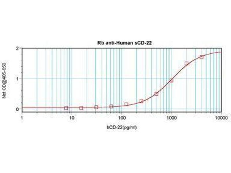Usage: ELISA: To detect hCD22 by sandwich ELISA (using 100 μL/well antibody solution) a concentration of 0.5-2 μg/mL of this antibody is required. This antigen affinity purified antibody, in conjunction with Biotinylated Anti-Human CD22 (LS-C104523) as a detection antibody, allows the detection of at least 0.2-0.4 ng/well of recombinant hCD22. Western Blot: To detect hCD22 by Western Blot analysis this antibody can be used at a concentration of 0.1-0.2 μg/mL. Used in conjunction with compatible secondary reagents the detection limit for recombinant hCD22 is 1.5-3 ng/lane, under either reducing or non-reducing conditions. -