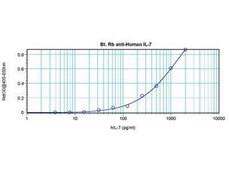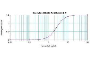 Usage: The applications listed have been tested for the unconjugated form of this product. Other forms have not been tested. ELISA: To detect Human IL-7 by direct ELISA (using 100 μL/well antibody solution) a concentration of 0.25-1 μg/mL of this antibody is required. This biotinylated polyclonal antibody, in conjunction with compatible secondary reagents, allows the detection of at least 0.2-0.4 ng/well of recombinant Human IL-7. To detect Human IL-7 by sandwich ELISA (using 100 μL/well antibody solution) a concentration of 0.25-1 μg/mL of this antibody is required. This biotinylated polyclonal antibody, in conjunction with Polyclonal Anti-Human IL-7 (LS-C104554) as a capture antibody, allows the detection of at least 0.2-0.4 ng/well of recombinant Human IL-7. Western Blot: To detect Human IL-7 by Western Blot analysis this antibody can be used at a concentration of 0.1-0.2 μg/mL. When used in conjunction with compatible secondary reagents, the detection limit for recombinant hIL-7 is 1.5-3 ng/lane, under either reducing or non-reducing conditions. -