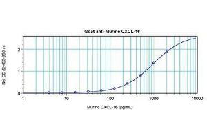 Usage: ELISA: To detect mCXCL16 by sandwich ELISA (using 100 μL/well antibody solution) a concentration of 0.5-2 μg/mL of this antibody is required. This antigen affinity purified antibody, in conjunction with Biotinylated Anti-Murine CXCL16 (LS-C104579) as a detection antibody, allows the detection of at least 0.2-0.4 ng/well of recombinant mCXCL16. Western Blot: To detect mCXCL16 by Western Blot analysis this antibody can be used at a concentration of 0.1-0.2 μg/mL. Used in conjunction with compatible secondary reagents the detection limit for recombinant mCXCL16 is 1.5-3 ng/lane, under either reducing or non-reducing conditions. -