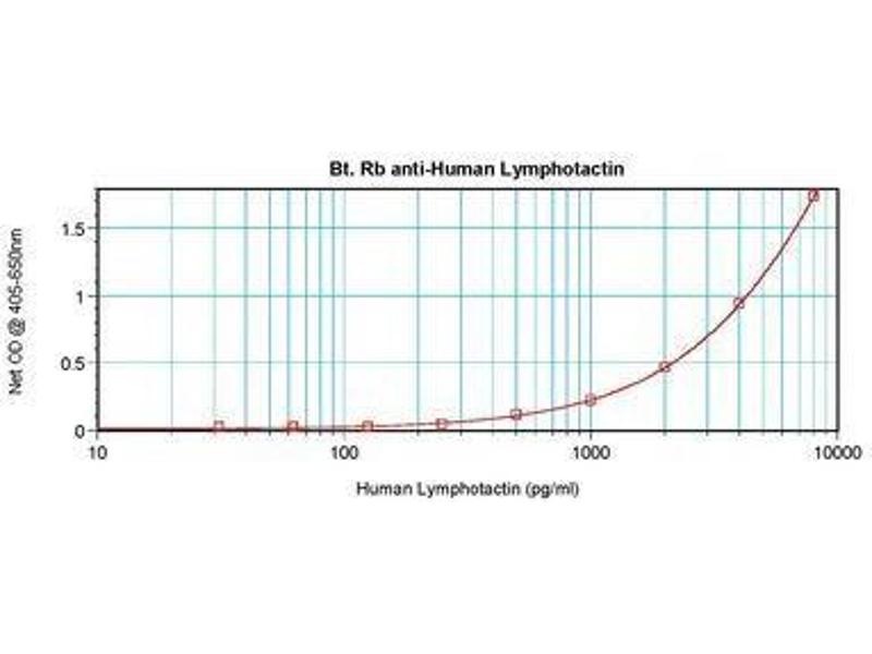 Usage: The applications listed have been tested for the unconjugated form of this product. Other forms have not been tested. ELISA: To detect hLymphotactin by direct ELISA (using 100 μL/well antibody solution) a concentration of 0.25-1 μg/mL of this antibody is required. This biotinylated polyclonal antibody, in conjunction with compatible secondary reagents, allows the detection of at least 0.2-0.4 ng/well of recombinant hLymphotactin. To detect hLymphotactin by sandwich ELISA (using 100 μL/well antibody solution) a concentration of 0.25-1 μg/mL of this antibody is required. This biotinylated polyclonal antibody, in conjunction with Polyclonal Anti-Human Lymphotactin (LS-C104661) as a capture antibody, allows the detection of at least 0.2-0.4 ng/well of recombinant hLymphotactin. Western Blot: To detect hLymphotactin by Western Blot analysis this antibody can be used at a concentration of 0.1-0.2 μg/mL. Used in conjunction with compatible secondary reagents the detection limit for recombinant hLymphotactin is 1.5-3 ng/lane, under either reducing or non-reducing conditions. -