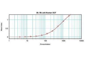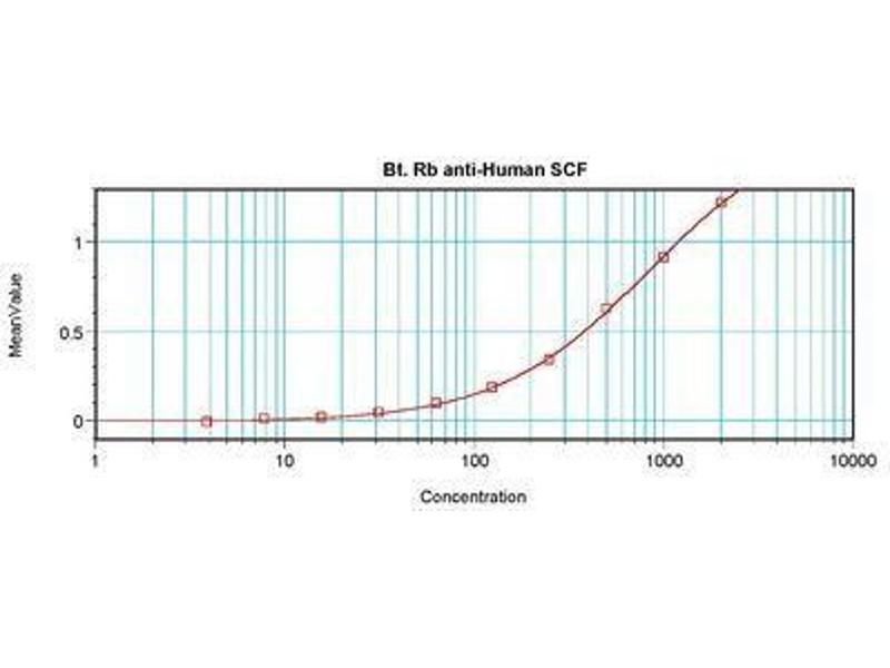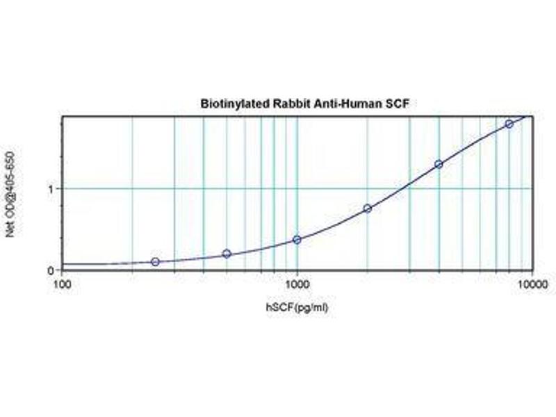 Usage: The applications listed have been tested for the unconjugated form of this product. Other forms have not been tested. ELISA: To detect hSCF by direct ELISA (using 100 μL/well antibody solution) a concentration of 0.25-1 μg/mL of this antibody is required. This biotinylated polyclonal antibody, in conjunction with compatible secondary reagents, allows the detection of at least 0.2-0.4 ng/well of recombinant hSCF. To detect hSCF by sandwich ELISA (using 100 μL/well antibody solution) a concentration of 0.25-1 μg/mL of this antibody is required. This biotinylated polyclonal antibody, in conjunction with Polyclonal Anti-Human SCF (LS-C104667) as a capture antibody, allows the detection of at least 0.2-0.4 ng/well of recombinant hSCF. Western Blot: To detect hSCF by Western Blot analysis this antibody can be used at a concentration of 0.1-0.2 μg/mL. Used in conjunction with compatible secondary reagents the detection limit for recombinant hSCF is 1.5-3 ng/lane, under either reducing or non-reducing conditions.
