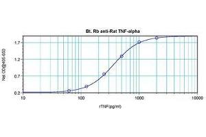 Usage: The applications listed have been tested for the unconjugated form of this product. Other forms have not been tested. ELISA: To detect Rat TNF-alpha by direct ELISA (using 100 μL/well antibody solution) a concentration of 0.25-1 μg/mL of this antibody is required. This biotinylated polyclonal antibody, in conjunction with compatible secondary reagents, allows the detection of at least 0.2-0.4 ng/well of recombinant Rat TNF-alpha. To detect Rat TNF-alpha by sandwich ELISA (using 100 μL/well antibody solution) a concentration of 0.25-1 μg/mL of this antibody is required. This biotinylated polyclonal antibody, in conjunction with Polyclonal Anti-Rat TNF-alpha (LS-C104761) as a capture antibody, allows the detection of at least 0.2-0.4 ng/well of recombinant Rat TNF-alpha. Western Blot: To detect Rat TNF-alpha by Western Blot analysis this antibody can be used at a concentration of 0.1-0.2 μg/mL. When used in conjunction with compatible secondary reagents, the detection limit for recombinant Rat TNF-alpha is 1.5-3 ng/lane, under either reducing or non-reducing conditions. -