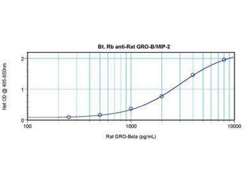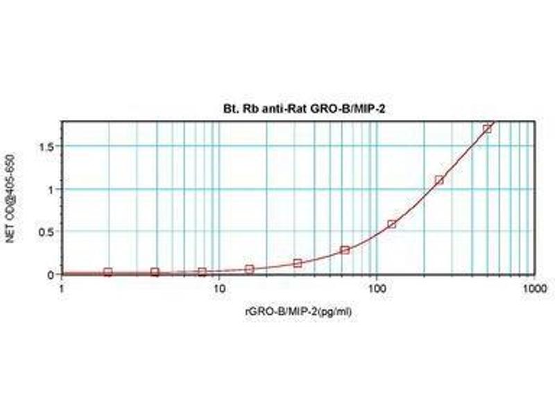 Usage: The applications listed have been tested for the unconjugated form of this product. Other forms have not been tested. ELISA: To detect Rat GRO-beta/MIP-2 by direct ELISA (using 100 μL/well antibody solution) a concentration of 0.25-1 μg/mL of this antibody is required. This biotinylated polyclonal antibody, in conjunction with compatible secondary reagents, allows the detection of at least 0.2-0.4 ng/well of recombinant Rat GRO-beta/MIP-2.. To detect Rat GRO-beta/MIP-2 by sandwich ELISA (using 100 μL/well antibody solution) a concentration of 0.25-1 μg/mL of this antibody is required. This biotinylated polyclonal antibody, in conjunction with Polyclonal Anti-Rat GRO-beta/MIP-2 (LS-C104776) as a capture antibody, allows the detection of at least 0.2-0.4 ng/well of recombinant Rat GRO-beta/MIP-2. Western Blot: To detect Rat GRO-beta/MIP-2 by Western Blot analysis this antibody can be used at a concentration of 0.1-0.2 μg/mL. Used in conjunction with compatible secondary reagents the detection limit for recombinant Rat GRO-beta/MIP-2 is 1.5-3 ng/lane, under either reducing or non-reducing conditions. -