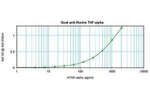 Usage: Immunohistochemistry: This antibody stained colchicine injected mouse brain (hippocampus CA1 region) tissue. The primary antibody was incubated at 1 μg/mL overnight at 4 °C. This was followed by a peroxidase conjugated secondary antibody and then a fluorescein Tyramide Signal Amplification (TSA) reagent. Optimal concentrations and conditions may vary. Information and photo are courtesy of the Tissue Profiling group, SciLifeLab Stockholm. Neutralization: To yield one-half maximal inhibition [ND] of the biological activity of Murine TNF-alpha (0.25 ng/mL), a concentration of 0.05-0.08 μg/mL of this antibody is required. ELISA: To detect Murine TNF-alpha by sandwich ELISA (using 100 μL/well antibody solution) a concentration of 0.5-2 μg/mL of this antibody is required. This antigen affinity purified antibody, in conjunction with Biotinylated Anti-Murine TNF-alpha (LS-C104810) as a detection antibody, allows the detection of at least 0.2-0.4 ng/well of recombinant Murine TNF-alpha. Western Blot: To detect Murine TNF-alpha by Western Blot analysis this antibody can be used at a concentration of 0.1-0.2 μg/mL. When used in conjunction with compatible secondary reagents, the detection limit for recombinant Murine TNF-alpha is 1.5-3 ng/lane, under either reducing or non-reducing conditions. -