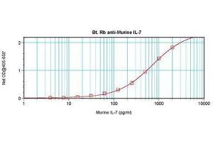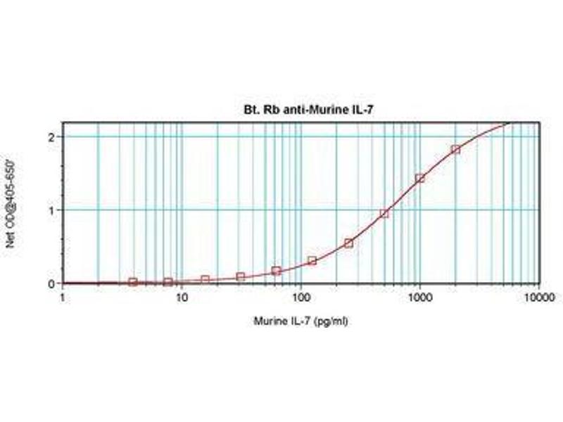 Usage: The applications listed have been tested for the unconjugated form of this product. Other forms have not been tested. ELISA: To detect Murine IL-7 by direct ELISA (using 100 μL/well antibody solution) a concentration of 0.25-1 μg/mL of this antibody is required. This biotinylated polyclonal antibody, in conjunction with compatible secondary reagents, allows the detection of at least 0.2-0.4 ng/well of recombinant Murine IL-7. To detect Murine IL-7 by sandwich ELISA (using 100 μL/well antibody solution) a concentration of 0.25-1 μg/mL of this antibody is required. This biotinylated polyclonal antibody, in conjunction with Polyclonal Anti-Murine IL-7 (LS-C104812) as a capture antibody, allows the detection of at least 0.2-0.4 ng/well of recombinant Murine IL-7. Western Blot: To detect Murine IL-7 by Western Blot analysis this antibody can be used at a concentration of 0.1-0.2 μg/mL. When used in conjunction with compatible secondary reagents the detection limit for recombinant Murine IL-7 is 1.5-3 ng/lane, under either reducing or non-reducing conditions. -