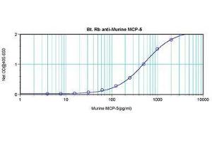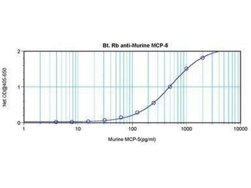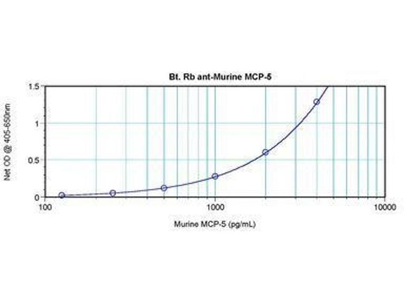 Usage: The applications listed have been tested for the unconjugated form of this product. Other forms have not been tested. ELISA: To detect mMCP-5 by direct ELISA (using 100 μL/well antibody solution) a concentration of 0.25-1 μg/mL of this antibody is required. This biotinylated polyclonal antibody, in conjunction with compatible secondary reagents, allows the detection of at least 0.2-0.4 ng/well of recombinant mMCP-5. To detect mMCP-5 by sandwich ELISA (using 100 μL/well antibody solution) a concentration of 0.25-1 μg/mL of this antibody is required. This biotinylated polyclonal antibody, in conjunction with Polyclonal Anti-Murine MCP-5 (LS-C104804) as a capture antibody, allows the detection of at least 0.2-0.4 ng/well of recombinant mMCP-5. Western Blot: To detect mMCP-5 by Western Blot analysis this antibody can be used at a concentration of 0.1-0.2 μg/mL. Used in conjunction with compatible secondary reagents the detection limit for recombinant mMCP-5 is 1.5-3 ng/lane, under either reducing or non-reducing conditions. -