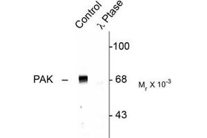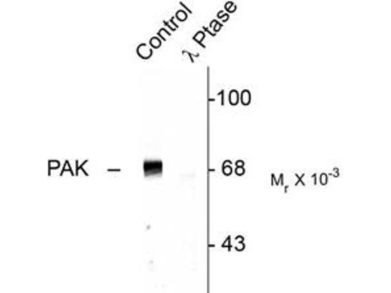 - Specific for the ~68k to ~70k PAK protein phosphorylated at Thr402. The immunolabeling of PAK is completely eliminated by X-phosphatase treatment