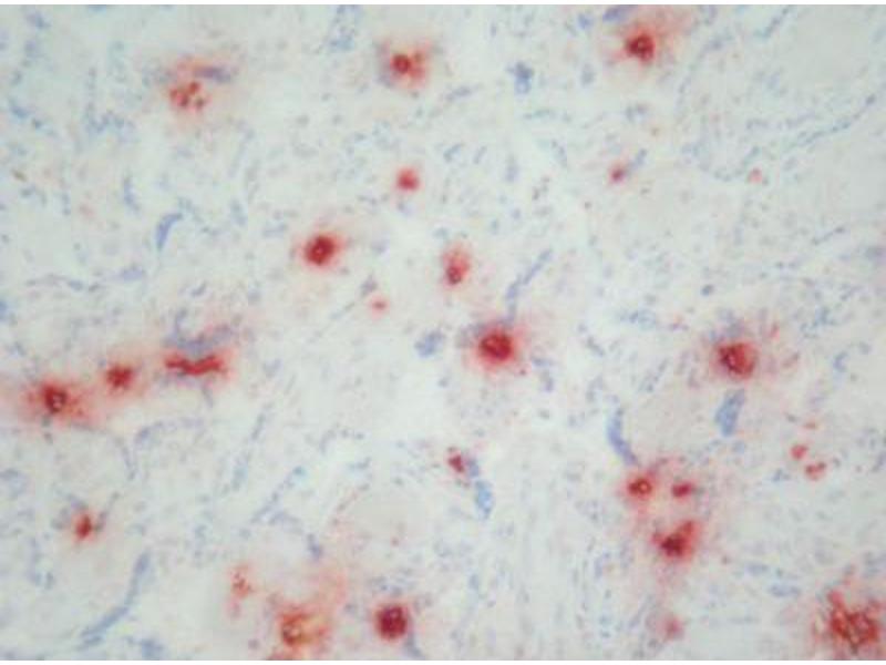 Several defensins are recognized, the epitope has not been further characterized. Biological functions: Various functions have been described for defensins. They are antibacterial, antifungal, chemotactic for monocytes, inhibitory for ACTH-induced corticosteroid synthesis and cytotoxic for cells. Defensins are inhibited by glucosaminoglycans (self protection for cells) and high concentrations of Calpha 2+ ions. Biochemistry: Defensins are a group of cyclic peptides containing 29-35 amino acids (MW < 3500) which tend to form aggregates. The molecules are protease resistant. The defensin content of azurophilic granules in neutrophils is approximately 30 % of the total protein. Specificity: Human: Defensin 1-3 (HNP-1 to HNP-3) in human neutrophils. Synthetic defensin-1 and -2 (Bachem, Bubendorf CH) stain also positively. Not tested with Defensin-4. A side reaction to elastin has been observed in humans. Other: not tested. Defensins have been described in rabbits (NP-1 to NP-5, NP3a = Corticostatin), and in mice (cryptodin).