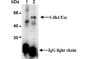 - Two highly conserved WD40-repeat proteins, Cdc20 and Cdh1/Hct1, have been identified as limiting, substrate-specific regulators for anaphase-promoting complex (APC)-dependent proteolysis. Cdc20 and Cdh1 bind directly to APC and activate its cyclin ubiquitination activity. Cdc20 activates APC at the onset of anaphase, while Cdh1 activates APC from late anaphase through G1. Phosphorylation of Cdh1 by cyclin dependent kinases (Cdks), such as Cdc28, blocked Cdh1-APC interaction and APC activation, while dephosphorylation by the phosphatase Cdc14 restored this activity. Activation of the APC and cyclin degradation is required for exit from mitosis, hence, the phosphorylation of Cdc20 and Cdh1 by Cdks regulate APC activity and may control the precise progression of mitosis.Synonyms: CDC20-like protein 1, Cdh1/Hct1 homolog, FYR, FZR, Fizzy-related protein homolog, KIAA1242
