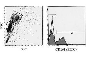 Flow Cytometric analysis for floating cellsProtocol 1We usually use Fisher tubes or equivalents as reaction tubes for all step described below. 1) Resuspend the cells with washing buffer (5x10e6 cells/mL). 2) Add 50 µL of the cell suspension into each tube, and centrifuge at 500xg for 1 minute atroom temperature (20~25°C). Remove supernatant by careful aspiration. 3) Add 10 µL of normal goat serum containing 1 mg/mL normal human IgG and 0. 1% NaN3to the cell pellet after tapping. Mix well, and incubate for 5 minutes at room temperature(20~25°C). 4) Add 30 µL of the CD161 monoclonal antibody (10-20 µg/mL) diluted with the washingbuffer. Mix well, and incubate for 30 minutes at room temperature (20~25°C). 5) Add 1 mL of the washing buffer followed by centrifugation at 500xg for 1 minute at roomtemperature (20~25°C). Remove supernatant by careful aspiration. 6) Add 30 µL of secondary antibody (1: 40 FITC conjugated anti-mouse IgG diluted with thewashing buffer. Mix well and incubate for 15 minutes at room temperature (20~25°C). 7) Add 1 mL of the washing buffer followed by centrifugation at 500xg for 1 minute at roomtemperature (20~25°C). Remove supernatant by careful aspiration. 8) Resuspend the cells with 500 µL of the washing buffer and analyze by a flow cytometer. Protocol 2We usually use Fisher tubes or equivalents as reaction tubes for all step described below. 1) Wash the cells 3 times with washing buffer [PBS containing 2% fetal calf serum (FCS) and0. 1% NaN3]. 2) Resuspend the cells with PBS containing 25% normal goat serum, 1 mg/mL normalhuman IgG and 0. 1% NaN3 (5x10e6 cells/mL). 3) Add 20 µL of the CD161 monoclonal antibody (50 µg/mL) diluted with the washing bufferinto each tube. 4) Add 50 µL of the cell suspension into each tube. Mix well, and incubate for 30 minutesat room temperature (20~25°C). 5) Add 1 mL of the washing buffer followed by centrifugation at 500xg for 1 minute at roomtemperature (20~25°C). Remove supernatant by careful aspiration. 6) Resuspend the cells with 50 µL of the washing buffer. 7) Add 20 µL of secondary antibody (1: 10 FITC conjugated anti-mouse IgG diluted with thewashing buffer into each tube. Mix well and incubate for 15 minutes at room temperature. 8) Add 1 mL of the washing buffer followed by centrifugation at 500xg for 1 minute at roomtemperature (20~25°C). 9) Resuspend the cells with 500 µL of the washing buffer and analyze by a flow cytometer. Flow Cytometric analysis for whole blood cellsWe usually use Falcon tubes or equivalents as reaction tubes for all step described below. 1) Add 20 µL of the CD161 monoclonal antibody (50 µg/mL) diluted with washing buffer[PBS containing 2% fetal calf serum (FCS) and 0. 1% NaN3] into each tube. 2) Add 50 µL of whole blood into each tube. Mix well, and incubate for 30 minutes at roomtemperature (20~25°C). 3) Add 2 mL of the washing buffer followed by centrifugation at 500xg for 1 minute at roomtemperature (20~25°C). Remove supernatant by careful aspiration. 4) Add 50 µL of secondary antibody (1: 20 FITC conjugated anti-mouse IgG diluted with thewashing buffer. Mix well and incubate for 15 minutes at room temperature (20~25°C). 5) Lyse with OptiLyse C (for analysis on Beckman Coulter instruments) or OptiLyse B (foranalysis on BD instruments), using the procedure recommended in the respective package