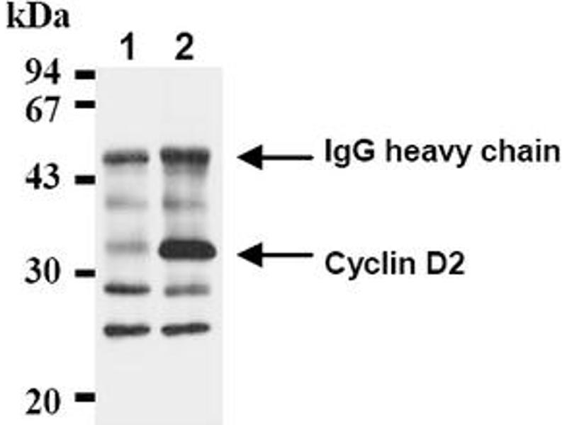 SDS-PAGE & Western Blotting1) Wash the cells 3 times with PBS and suspend with 10 volume of cold Lysis buffer (50 mMTris-HCl, pH 7. 2, 250 mM NaCl, 0. 1% NP-40, 2 mM EDTA, 10% glycerol) containingappropriate protease inhibitors. Incubate it at 4°C with rotating for 30 minutes, thensonicate briefly (up to 10 seconds). 2) Centrifuge the tube at 12,000 x g for 10 minutes at 4°C and transfer the supernatant toanother tube. Measure the protein concentration of the supernatant and add the Lysisbuffer to make 8 mg/mL solution. 3) Mix the sample with equal volume of Laemmli's sample buffer. 4) Boil the samples for 2 minutes and centrifuge. Load 10 μL of the sample per lane in a 1mm thick SDS-polyacrylamide gel for electrophoresis. 5) Blot the protein to a polyvinylidene difluoride (PVDF) membrane at 1 mA/cm2 for 1 hourin a semi-dry transfer system. (Transfer Buffer: 25 mM Tris, 190 mM glycine, 20% MeOH). See the manufacture's manual for precise transfer procedure. 6) To reduce nonspecific binding, soak the membrane in 10% skimmed milk (in PBS, pH7. 2) for 1 hour at RT, or overnight at 4°C. 7) Incubate the membrane with the anti-cyclin D2 monoclonal antibody (1 μg/mL) dilutedwith 1% skimmed milk (in PBS, pH 7. 2) for 1 hour at RT8) Wash the membrane with PBS (5 min x 6 times). 9) Incubate the membrane with the 1: 10000POD-conjugated anti-mouse IgG diluted with 1% skimmed milk (in PBS, pH 7. 2) for 1 h atRT. 10) Wash the membrane with PBS (5 minutes x 6 times)11) Wipe excess buffer on the membrane, then incubate it with appropriatechemiluminescence reagent for 1 minute. Remove extra reagent from the membrane bydabbing with paper towel, and seal it in plastic wrap. 12) Expose to an X-ray film in a dark room for 5 minutes. Develop the film as usual. Thecondition for exposure and development may vary. Positive Control for Western blotting: NIH/3T3Immunoprecipitation1) Wash the cells 3 times with PBS and suspend with 10 volume of cold Lysis buffer (50 mMTris-HCl pH 7. 2, 250 mM NaCl, 0. 1% NP-40, 2 mM EDTA, 10% glycerol) containingappropriate protease inhibitors. Incubate it at 4°C with rotating for 30 minutes, thensonicate briefly (up to 10 seconds)2) Centrifuge the tube at 12,000 x g for 10 min at 4°C and transfer the supernatant toanother tube. 3) Add 2 μg of the anti-cyclin D2 monoclonal antibody into 250 μL of the supernatant. Mixwell and incubate with gentle agitation for 30-120 minutes at 4°C. Add 20 μL of 50%Protein A-agarose beads resuspended in the Lysis buffer. Mix well and incubate with gentleagitation for 60 min at 4°C. 4) Wash the beads 3-5 times with the ice-cold Lysis buffer (centrifuge the tube at 2,500 x gfor 10 seconds). 5) Resuspend the beads in 20 μL of Laemmli’s sample buffer, boil for 3-5 min, andcentrifuge for 5 minutes. Use 10 μL/lane for the SDS-PAGE analysis. (See SDS-PAGE & Western blotting. )
