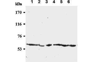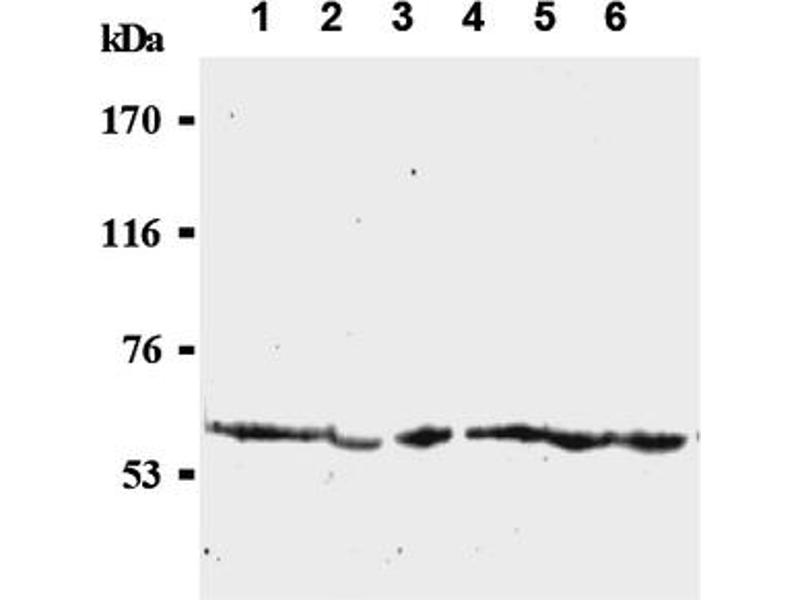 SDS-PAGE & Western Blotting1) Wash the cells 3 times with PBS and suspend with 10 volume of cold Lysis buffer (50 mMTris-HCl, pH 7. 2, 250 mM NaCl, 0. 1% NP-40, 2 mM EDTA, 10% glycerol) containingappropriate protease inhibitors. Incubate it at 4°C with rotating for 30 minutes, thensonicate briefly (up to 10 seconds). 2) Centrifuge the tube at 12,000 x g for 10 minutes at 4°C and transfer the supernatant toanother tube. Measure the protein concentration of the supernatant and add the Lysisbuffer to make 8 mg/mL solution. 3) Mix the sample with equal volume of Laemmli’s sample buffer. 4) Boil the samples for 2 minutes and centrifuge. Load 10 μL of the sample per lane in a 1mm thick SDS-polyacrylamide gel for electrophoresis. 5) Blot the protein to a polyvinylidene difluoride (PVDF) membrane at 1 mA/cm2 for 1 hourin a semi-dry transfer system. (Transfer Buffer: 25 mM Tris, 190 mM glycine, 20% MeOH). See the manufacture's manual for the transfer procedure. 6) To reduce nonspecific binding, soak the membrane in 10% skimmed milk (in PBS, pH7. 2) for 1 hour at room temperature, or overnight at 4°C. 7) Incubate the membrane with primary antibody diluted with PBS, pH 7. 2 containing 1%skimmed milk as suggested in the APPLICATIONS for 1 hour at room temperature. (Theoptimal antibody concentration will depend on the experimental conditions. 8) Wash the membrane with PBS (5 minutes x 6 times). 9) Incubate the membrane with the 1: 10,000 POD-conjugated anti-mouse IgG diluted with1% skimmed milk (in PBS, pH 7. 2) for 1 hour at room temperature. 10) Wash the membrane with PBS (5 minutes x 6 times). 11) Wipe excess buffer from the membrane, then incubate it with appropriatechemiluminescence reagents for 1 minute. Remove extra reagent from the membrane bydabbing with a paper towel, and seal it in plastic wrap. 12) Expose to an X-ray film in a dark room for 5 minutes. Develop the film as usual. Theconditions for exposure and development may vary. Positive Controls for Western blotting: HeLa, A431, ZR75-1, HEp-2, NIH/3T3, PC12