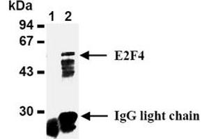 The E2F family of transcription factors regulates gene expression following heterodimerization with the DP family proteins, which promote transition to S phase from G1 phase. E2F activity is controlled by interactions with the retinoblastoma tumor suppressor family (pRB, p107 and p130). E2F proteins can be divided into three groups on homology and on certain functional characteristics. The first group containing E2F-1, E2F-2 and E2F-3 binds exclusively to pRB and has a cyclin A binding domain that mediates inhibition of DNA binding during entry into S phase. The second group is composed of E2F-4 and E2F-5, which preferentially bind to p107 and p130, although they can bind pRB as well. The last member is E2F-6. E2F-6 appears to act as a transcription repressor. E2F-4 and E2F-5 are functionally different from E2F-1 and E2F-3. E2F-1 and E2F-3 participate in cellular proliferation, whereas E2F-4 and E2F-5 are required for cell cycle arrest in G1 induced by cyclin-dependent kinase inhibitor p16INK4a.Synonyms: E2F transcription factor 4, E2F-4, Transcription factor E2F4, p107/p130-binding