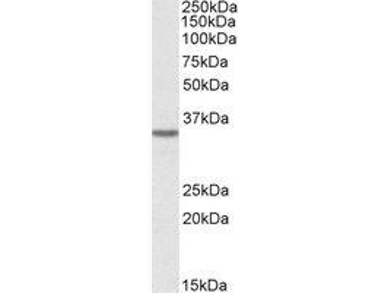 Peptide ELISA: Detection Limit Dilution: 1/8000. Western Blot: 0.1-0.5 μg/mL. Approx 35 kDa band observed in HeLa cell lysates (calculatedMW of 37.5 kDa according to Human NP_055209.2). Other applications not tested. Optimal dilutions are dependent on conditions and should be determined by the user.