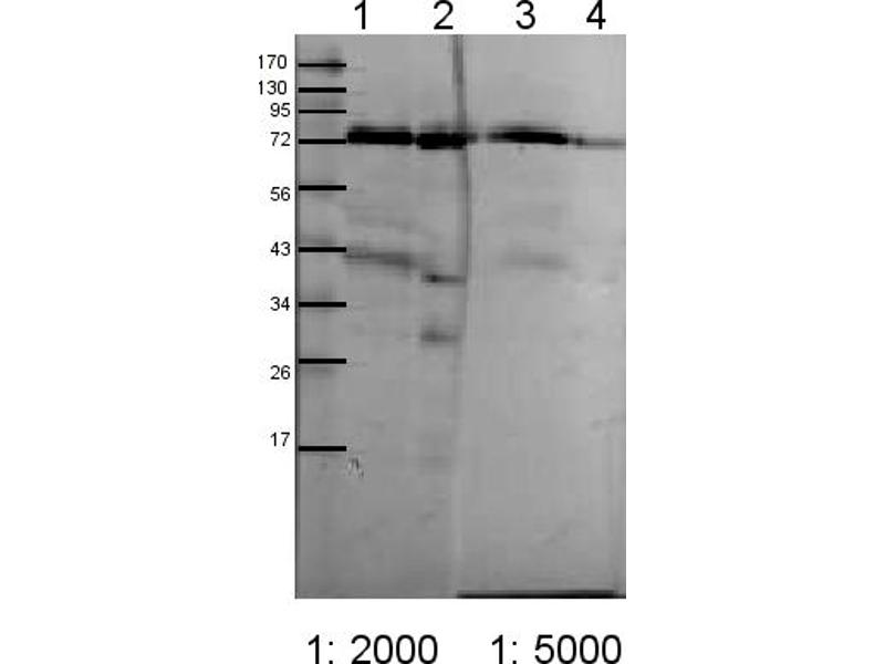 - Expected / apparent Molecular Weight of the Antigene: 88 / 75 kDa (ocassionally a processing intermediate at 78 kDa is observed)