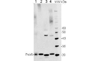 - KLH-conjugated synthetic peptide derived from available di and monocot PsbS sequences, including Arabidopsis thaliana (At1g44575)