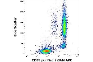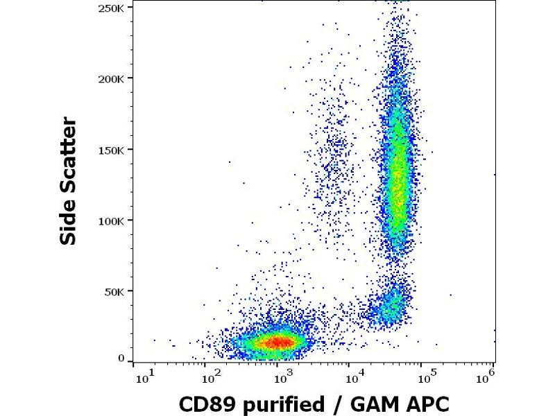The mouse monoclonal antibody A59 recognizes an extracellular epitope of CD89, a 55-100 kDa glycoprotein serving as a receptor for IgA and expressed mainly on granulocytes, monocytes and macrophages.