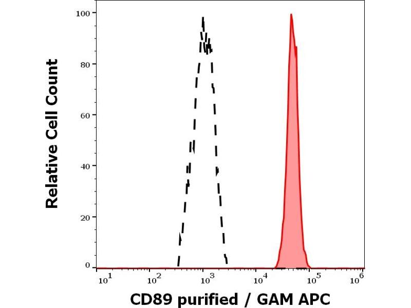 Fc fragment of IgA receptor,CD89 (Fc-alpha-R) is a type I transmembrane glycoprotein serving as a receptor for IgA. Soluble CD89 is detectable in serum and retains its IgA binding capacity. For signal transduction the association with FcR gamma chain homodimers is needed. CD89 is expressed on granulocytes, monocytes, macrophages, dendritic cells and myeloid cell lines. Its expression is upregulated in presence of IgA immune complexes, stimulators (such as LPS, PMA), TNF alpha, IL1 beta or GM-CSF, and it is downregulated in presence of TGF beta and suramin. Binding of IgA-opsonized targets to CD89 leads to phagocytic and cytotoxic processes of the immunologic defense.,FcalphaRI, FcAR, CTB-61M7.2