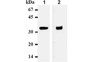 Western blotting: 0.1 μg/mL for chemiluminescence detection system. Immunoprecipitation: 2 μg/200 μL of cell extract. Immunohistochemistry on Paraffin Embedded Sections: 5 μg/mL (Heat treatmentnecessary). Microwave oven: 2 times for 10 minutes each in 10 mM citrate buffer ( pH 6.5). Detailed procedure is provided in Protocols. Other applications not tested. Optimal dilutions are dependent on conditions and should be determined by the user.