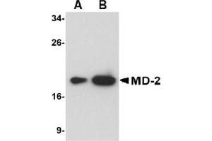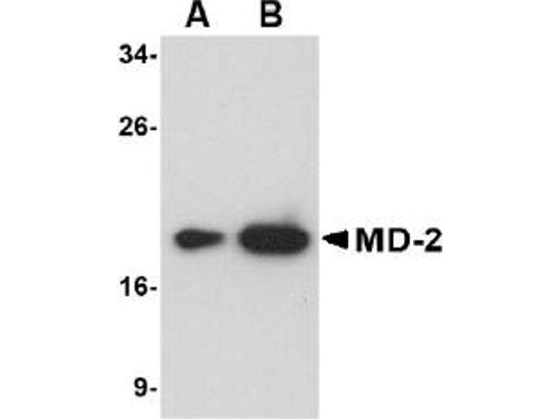 ELISA. Western Blot: MD2 antibody can be used for detection of MD2 at 0.5-1 μg/mL. Immunohistochemistry: 2.5 μg/mL Other applications not tested. Optimal dilutions are dependent on conditions and should be determined by the user.
