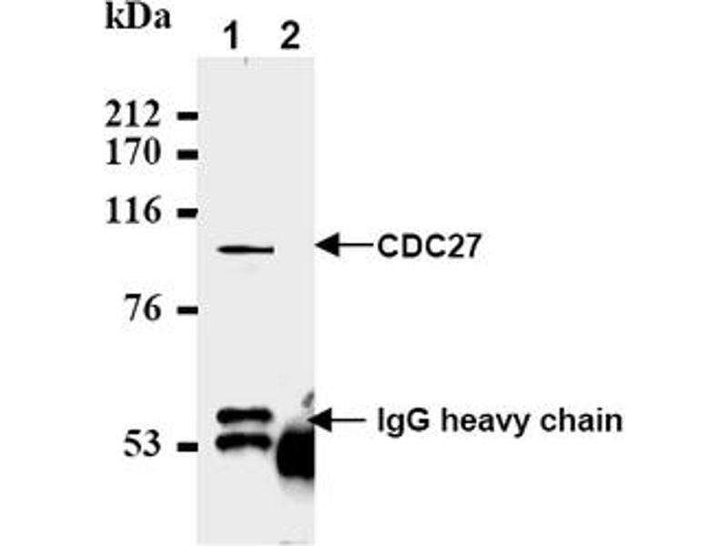 CDC16, CDC27 and CDC34 are components of the APC (anaphase-promoting complex) that also play a role as components of the ubiquitin- conjugating E3 enzyme. A 20S complex containing CDC27 and CDC16 catalyzes the mitosis-specific conjugation of ubiquitin to cyclin B, resulting in cyclin B/Cdk complex degradation. CDC27 is therefore required for progression of the cell cycle, where it executes essential mitotic functions near the metaphase/anaphase transition. CDC27 is ~97 kDa and is localized to the centrosome and mitotic spindle.Synonyms: CDC27Hs, Cell division cycle protein 27 homolog, D0S1430E, D17S978E, H-NUC