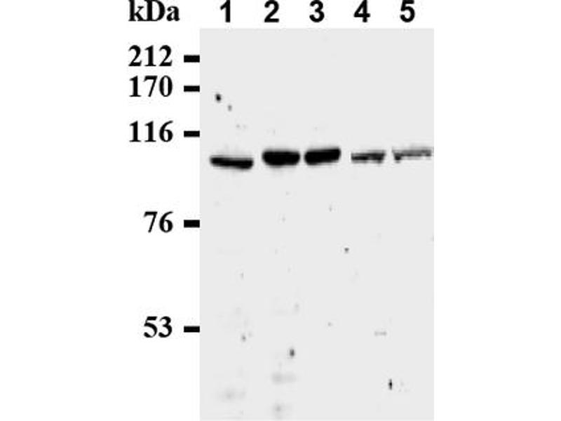 SDS-PAGE & Western Blotting1) Wash the cells 3 times with PBS and suspend with 10 volume of cold Lysis buffer (50 mMTris-HCl, pH 7. 2, 250 mM NaCl, 0. 1% NP-40, 2 mM EDTA, 10%glycerol) containingappropriate protease inhibitors. Incubate it at 4°C with rotating for 30 minutes, thensonicate briefly (up to 10 seconds). 2) Centrifuge the tube at 12,000 x g for 10 minutes at 4°C and transfer the supernatant toanother tube. Measure the protein concentration of the supernatant and add the cold Lysisbuffer to make 8 mg/mL solution. 3) Mix the sample with equal volume of Laemmli's sample buffer. 4) Boil the samples for 3 minutes and centrifuge. Load 10 μL of the sample per lane in a 1mm thick SDS-polyacrylamide gel for electrophoresis. 5) Blot the protein to a polyvinylidene difluoride (PVDF) membrane at 1 mA/cm2 for 1 hourin a semi-dry transfer system (Transfer Buffer: 25 mM Tris, 190 mM glycine, 20% MeOH). See the manufacture's manual for precise transfer procedure. 6) To reduce nonspecific binding, soak the membrane in 10% skimmed milk (in PBS, pH7. 2) for 1 hour at room temperature, or overnight at 4°C. 7) Incubate the membrane with primary antibody diluted with PBS, pH 7. 2 containing 1%skimmed milk as suggest in the APPLICATIONS for 1 hour at room temperature. (Theconcentration of antibody will depend on condition. )8) Wash the membrane with PBS-T [0. 05% Tween-20 in PBS] (5 minutes x 3 times). 9) Incubate the membrane with the 1: 10,000 HRP-conjugated anti-mouse IgG diluted with1% skimmed milk (in PBS, pH 7. 2) for 1 hour at RT. 10) Wash the membrane with PBS-T (10 minutes x 3 times). 11) Wipe excess buffer on the membrane, then incubate it with appropriatechemiluminescence reagent for 1 minute. 12) Remove extra reagent from the membrane by dabbing with paper towel, and seal it inplastic wrap. 13) Expose to an X-ray film in a dark room for 3 minutes. 14) Develop the film as usual. The condition for exposure and development may vary. Positive Controls: Jurkat, Raji, K562, HL-60, MCF-7Immunoprecipitation1) Wash the cells 3 x with PBS and suspend with 10 volume of cold Lysis buffer (50 mMTris-HCl pH 7. 2, 250 mM NaCl, 0. 1% NP-40, 2 mM EDTA, 10% glycerol) containingappropriate protease inhibitors. Incubate it at 4°C with rotating for 30 minutes, thensonicate briefly (up to 10 seconds). 2) Centrifuge the tube at 12,000 x g for 10 minutes at 4°C and transfer the supernatant toanother tube. 3) Add primary antibody as suggested in the APPLICATIONS into 200 µL of the supernatant.