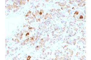 This mAb reacts with a protein of ~13 kDa, identified as alpha subunit of Luteinizing Hormone (LH) or Chorionic Gonadotrophin (CG). The protein dimer contains 2 polypeptide units, labeled alpha and beta subunits that are connected by two bridges. The alpha subunits of LH, FSH, TSH, and hCG are identical, and contain 92 amino acids. The beta subunits vary. LH has a beta subunit of 121 amino acids (LHB) that confers its specific biologic action and is responsible for interaction with the LH receptor. This beta subunit contains the same amino acids in sequence as the beta subunit of hCG and both stimulate the same receptor, however, the hCG beta subunit contains an additional 24 amino acids and the hormones differ in the composition of their sugar moieties. LH is synthesized and secreted by gonadotrophs in the anterior lobe of the pituitary gland. In concert with the other pituitary gonadotropin follicle-stimulating hormone (FSH), it is necessary for proper reproductive function. In the female, an acute rise of LH levels triggers ovulation. In the male, where LH has also been called Interstitial Cell-Stimulating Hormone (ICSH), it stimulates Leydig cell production of testosterone. LH is a useful marker in classification of pituitary tumors and the study of pituitary disease.