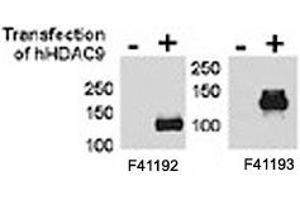 Titration of the HDAC9 antibody may be required due to differences in protocols and secondary/substrate sensitivity.\. Western blot: 1:1000,Immunoprecipitation: 1:100,Immunofluorescence: 1:1000,IHC (Paraffin): 1:50-1:100