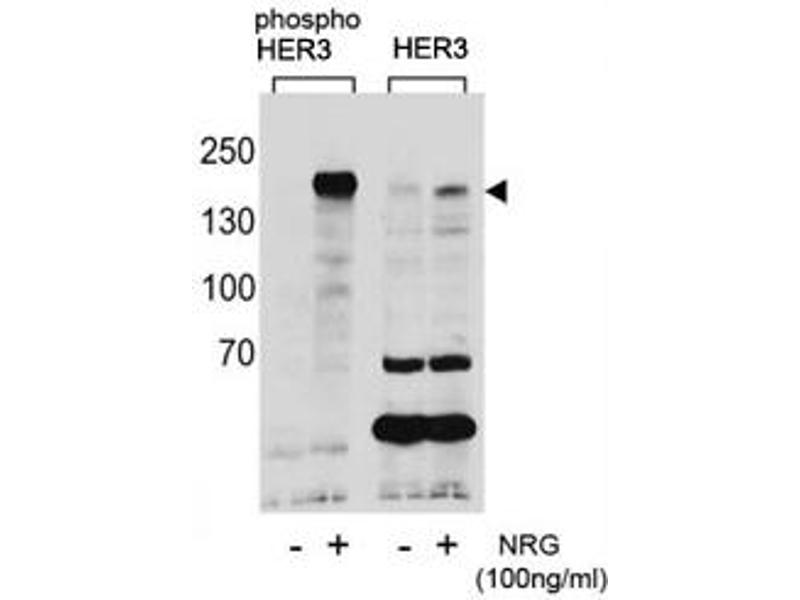 This phospho-HER3 antibody was produced from rabbits immunized with a KLH conjugated synthetic phosphopeptide corresponding to amino acid residues surrounding pY1289 of human HER3/ERBB3.