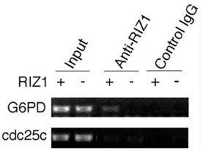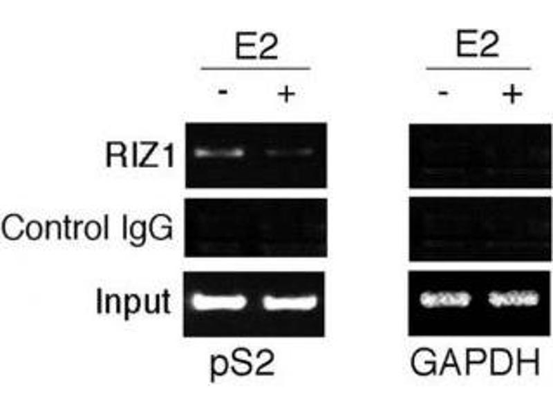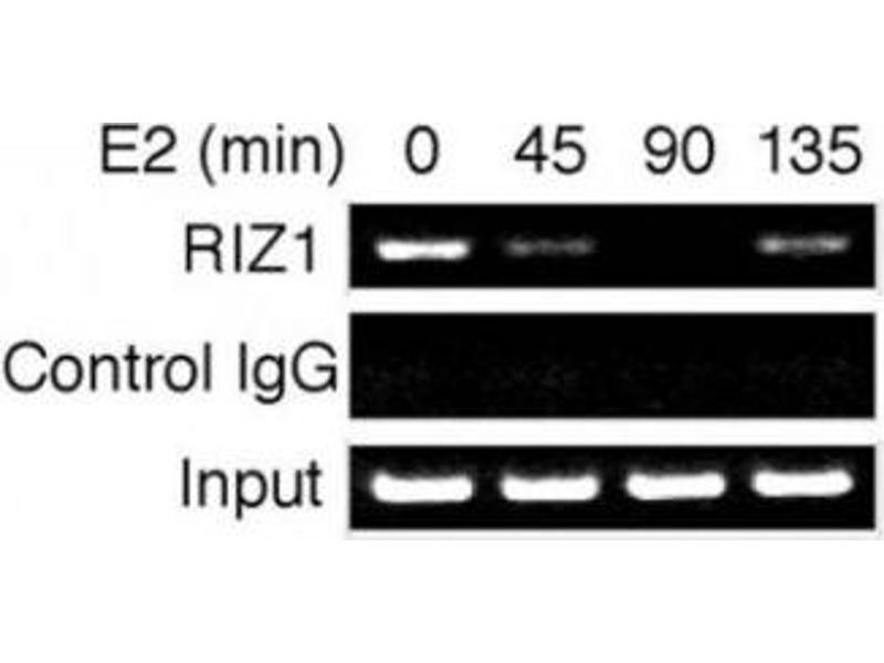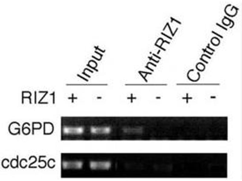 Titration of the RIZ1 antibody may be required due to differences in protocols and secondary/substrate sensitivity.\. Western blot: 1:1000,ChIP: 1:100