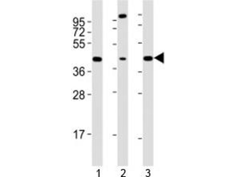 A portion of amino acids 350-400 (mouse) was used as immunogen for this Sox17 antibody.