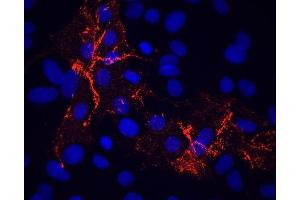 PP2 antiserum stains specifically desmosomal plaques present in simple and glandular epithelia, the basal layer of certain stratified epithelia, all layers of some stratified epithelia, and desmosome-possessing nonepithelial cells such as myocardium, Purkinje fibers, and dendritic reticulum of lymph node follicles. In all these cells, including a variety of cell types devoid of desmosomes, plakophilin 2 is highly enriched in the karyoplasm. Polypeptide reacting: Plakophilin 2, Mr ~100 kD (SDS-PAGE), MW calculated from aa sequence: 92,750 (pI 9.33) and 97,410 (pI 9.38)