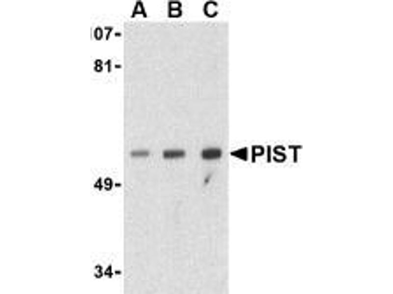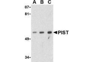 ELISA. Western Blot: PIST antibody can be used for the detection ob PIST at 1-2 μg/mL. Positive Control: PC-3 Cell Lysate. Immunohistochemistry on paraffin sections. Positive Control: Rat Colon Cell Lysate.