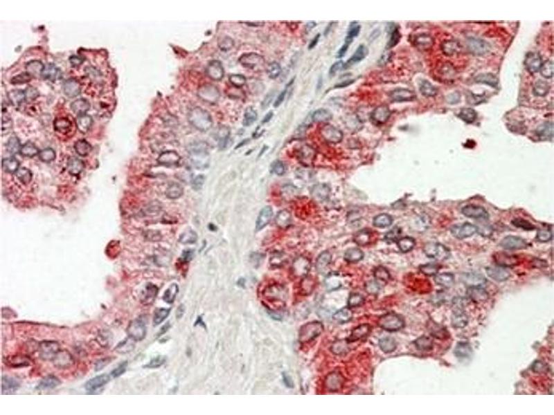 Prostatic acid phosphatase is one of the two antigenic markers of prostatic carcinoma, the other being prostate specific antigen. It belongs to the kallikrein family of serine proteases and is suggested to act as a hydrolase to split phospharyl choline in semen and as a transferase.Synonyms: ACP3, PAP, PSAP, Prostate acid phosphatase