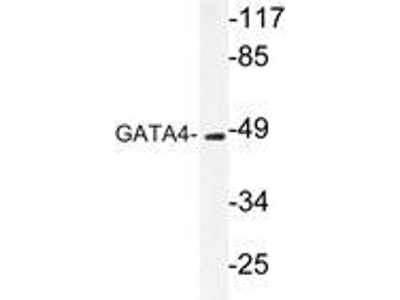 GATA4 is a 46 kDa member of the GATA family of zinc finger containing transcription factors that is involved in the development of cardiac hypertrophy and remodeling, and plays a critical role in regulating basal and agonist or stress induced gene expression in cardiac and smooth muscle cell types. GATA4 contains a conserved MAPK phosphorylation site at serine 105 within the transcriptional activation domain. Serine 105 of GATA4 is phosphorylated in response to agonist stimulation through MEK 1 ERK1 / 2, and weakly through JNK or p38 MAPKs.Synonyms: GATA-4, GATA-binding factor 4, Transcription factor GATA-4