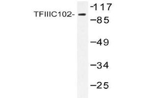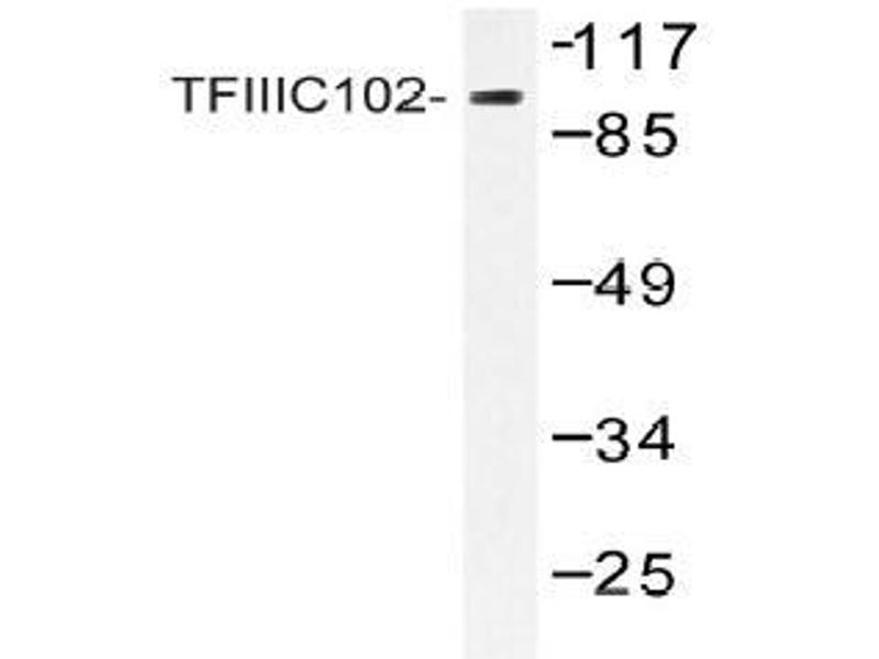 RNA polymerase (pol) III synthesizes tRNA, 5s rRNA, 7SL RNA and U6 snRNA and is overexpressed in many transformed cell lines and tumors in vivo, since cells must duplicate its protein components before division. Therefore, in order to maintain rapid growth, cells must produce a high level of Pol III transcribed RNA, which requires the presence of the TFIIIB and TFIIIC2 transcription factor complexes. The TFIIIC2 complex is composed of five subunits, TFIIIC220, TFIIIC110, TFIIIC102, TFIIIC90 and TFIIIC63, that are overexpressed in adenovirus transformed cells as well as in malignant cells in vivo, such as ovarian carcinomas. TFIIIC2 recruits RNA pol III and TFIIIB to promoter elements and may be a key component in the deregulation of malignant cells. The TFIIIB complex includes the TATA-binding protein (TBP), TFIIB-related factor 1 (BRF1) and TFIIIB, the expression of which are also upregulated in transformed cells. In many carcinomas, the tumor suppressors retinoblastoma (RB) and p53 are inactivated, which affects their ability to bind and inactivate the function of TFIIIB.Synonyms: General transcription factor 3C polypeptide 3, TFIIIC 102 kDa subunit, TFIIIC gamma, TFIIIC102, Transcription factor IIIC subunit gamma