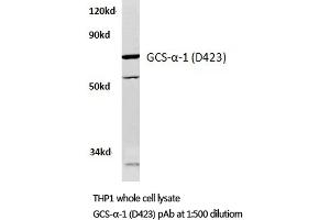 Guanylate cyclases belong to the adenylyl cyclase class-4/guanylyl cyclase family. There are two forms of guanylate cyclase. The soluble form, known as GCS or sGC, act as receptors for nitric oxide. The membrane-bound receptor form, known as GC, are peptide hormone receptors. GCS is a cGMP-synthesizing enzyme, which is the major receptor for the neurotransmitter nitric oxide (NO). It plays a crucial role in smooth muscle contractility, platelet reactivity and neurotransmission. GCS is a heme containing heterodimer, consisting of one 72 kDa alpha subunit and one 65 kDa beta subunit. The heme moeity mediates NO activation, and this heme group also binds carbon monoxide, which weakly stimulates the enzyme. Both NO and CO stimulation are enhanced by the allosteric activator 3-(5'-hydroxymethyl-2'furyl)-benzylindazole, YC-1. YC-1 can also stimulate GCS in a NOindependent manner. Both alpha and beta subunits are required for cGMP generation, and at least two isoforms exist for each subunit. Heterodimers consisting of alpha-1/beta-1 and alpha-2/beta-1 have been identified, and both display similar enzymatic activity.Synonyms: GCS-alpha-1, GCS-alpha-3, GUC1A3, GUCSA3, GUCY1A1, Guanylate cyclase soluble subunit alpha-3, Soluble guanylate cyclase large subunit, sGC alpha