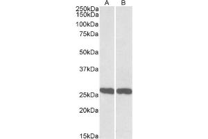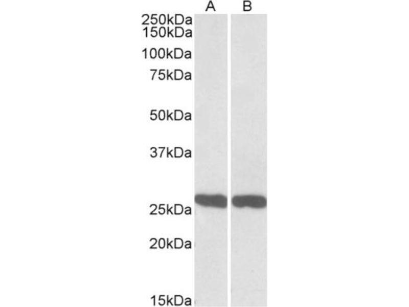 Peptide ELISA: Limit Dilution: 1/1000. Western blot: 0.3-1 μg/mL. This antibody detects a band of approx. 26 kDa in Human Brain(Cerebellum and Hippocampus) and Rat Brain lysates. Other applications not tested. Optimal dilutions are dependent on conditions and should be determined by the user.