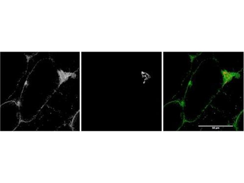 Myosin-Va has been implicated in the regulation of vesicle trafficking in neurons and melanocytes. It has been suggested that class V myosins associate with membrane vesicles through their C-terminal tails. Myosin V associates with synaptic vesicles and forms a stable complex with the synaptic vesicle membrane proteins, synaptobrevin II, and synaptophysin. The dilute Myo5a gene mutation in myosin Va leads to mental retardation, variable cellular immunodeficiency and impaired melanocyte function (pigmentary dilution), known as Griscelli syndrome in humans. Myosin Va regulates melanosome distribution along microfilaments. It is found in association with the centrosome at all stages of the cell cycle. In the interphase stage, myosin Va is found in pericentriolar material. During cell division, it is found in the cytoplasm and concentrates in a trail between migrating centrioles and in the mitotic spindle poles and spindle fibers.Synonyms: Dilute myosin heavy chain, MYH12, MYO5A, Myosin heavy chain 12, Myoxin, non-muscle