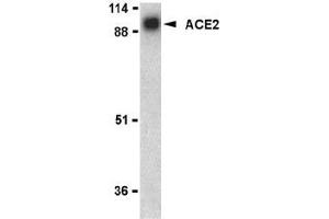 ELISA. Western Blot: ACE2 antibody can be used for the detection of ACE2 at 0.5 to 2 μg/mL. A 90 kDa band can be detected. Immunohistochemistry. Other applications not tested. Optimal dilutions are dependent on conditions and should be determined by the user.