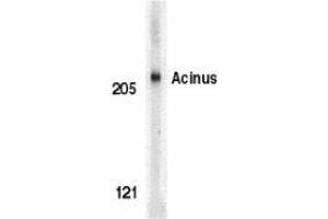 ELISA. Western Blot: Acinus antibody can be used for detection of Acinus at 0.5 to 1 μg/mL. A 220 kDa band can be detected. Immunocytochemistry. Other applications not tested. Optimal dilutions are dependent on conditions and should be determined by the user.