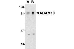 ELISA. Western Blot: ADAM10 can be used for detection of ADAM10 at 1: 500 to 1: 2000 dilution. Anapproximately 85 kDa band can be detected, which may represent precursor. Immunocytochemistry: 2,0 μg/mL Other applications not tested. Optimal dilutions are dependent on conditions and should be determined by the user.