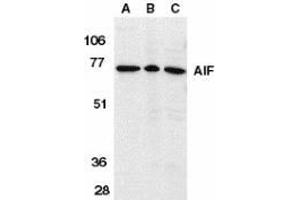 ELISA. Western Blot: AIF antibody can be used for detection of AIF at 0.25 to 1 μg/mL. A 67 kDaband should be detected. Immunohistochemistry. Other applications not tested. Optimal dilutions are dependent on conditions and should be determined by the user.