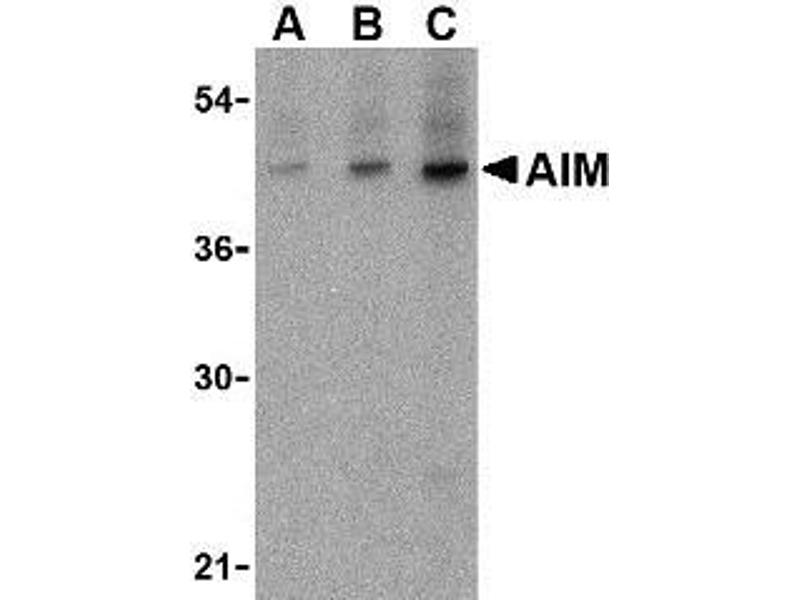 ELISA. Western Blot: AIM antibody can be used for the detection of AIM at 1 - 2 μg/mL. Immunohistochemistry. Other applications not tested. Optimal dilutions are dependent on conditions and should be determined by the user.