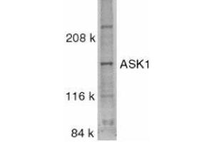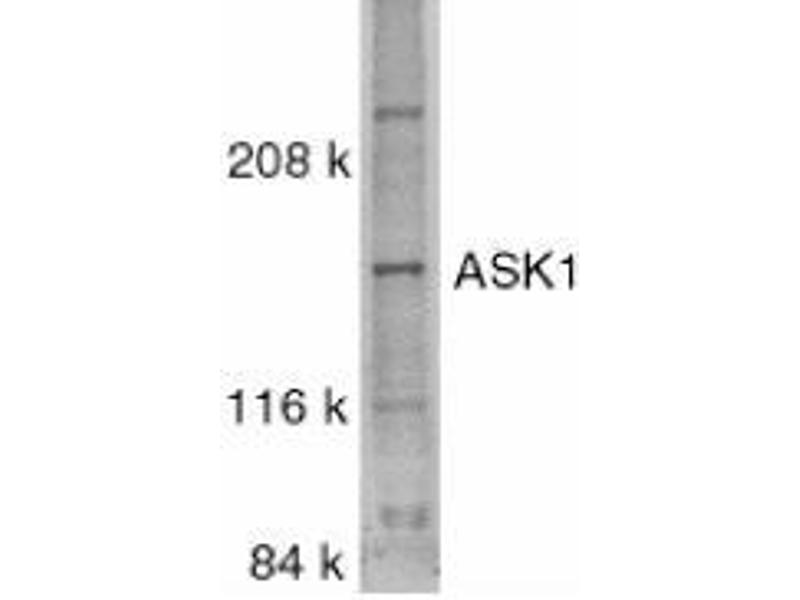 ELISA. Western Blot: ASK1 antibody can be used for detection of ASK1 at 1: 500 to 1: 1000 dilution. A 155 kDa band can be detected. Immunocytochemistry. Other applications not tested. Optimal dilutions are dependent on conditions and should be determined by the user.