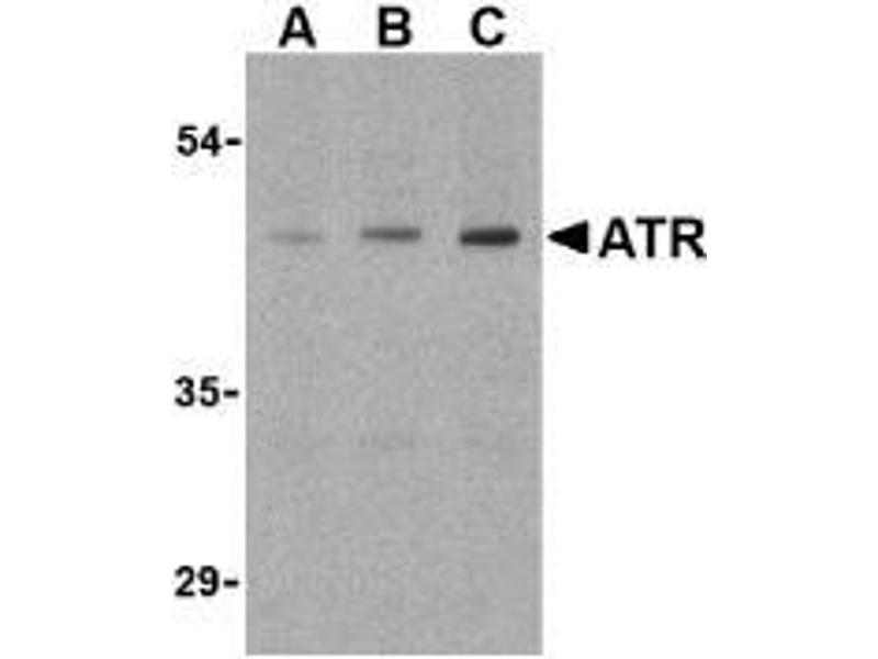 - ATR antibody was raised against a peptide corresponding to 13 amino acids near the center of human ATR. It will recognize all three isoforms.