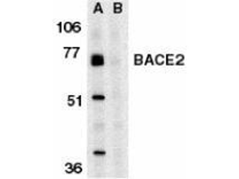 ELISA. Western Blot: BACE2 antibody can be used for detection of BACE2 at 0.5 to 1 μg/mL. Immunohistochemistry. Other applications not tested. Optimal dilutions are dependent on conditions and should be determined by the user.