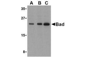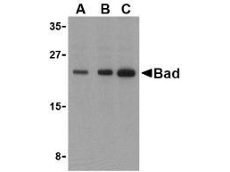 ELISA. Western Blot: Bad antibody can be used for detection of Bad at 0.5 to 1 μg/mL. Immunohistochemistry. Other applications not tested. Optimal dilutions are dependent on conditions and should be determined by the user.